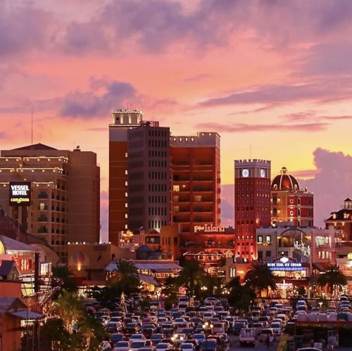 カップルに人気のお席。海に落ちる夕陽や、夜景が綺麗なアメリカンビレッジ。デートや休日のリフレッシュにオススメなスポットです。